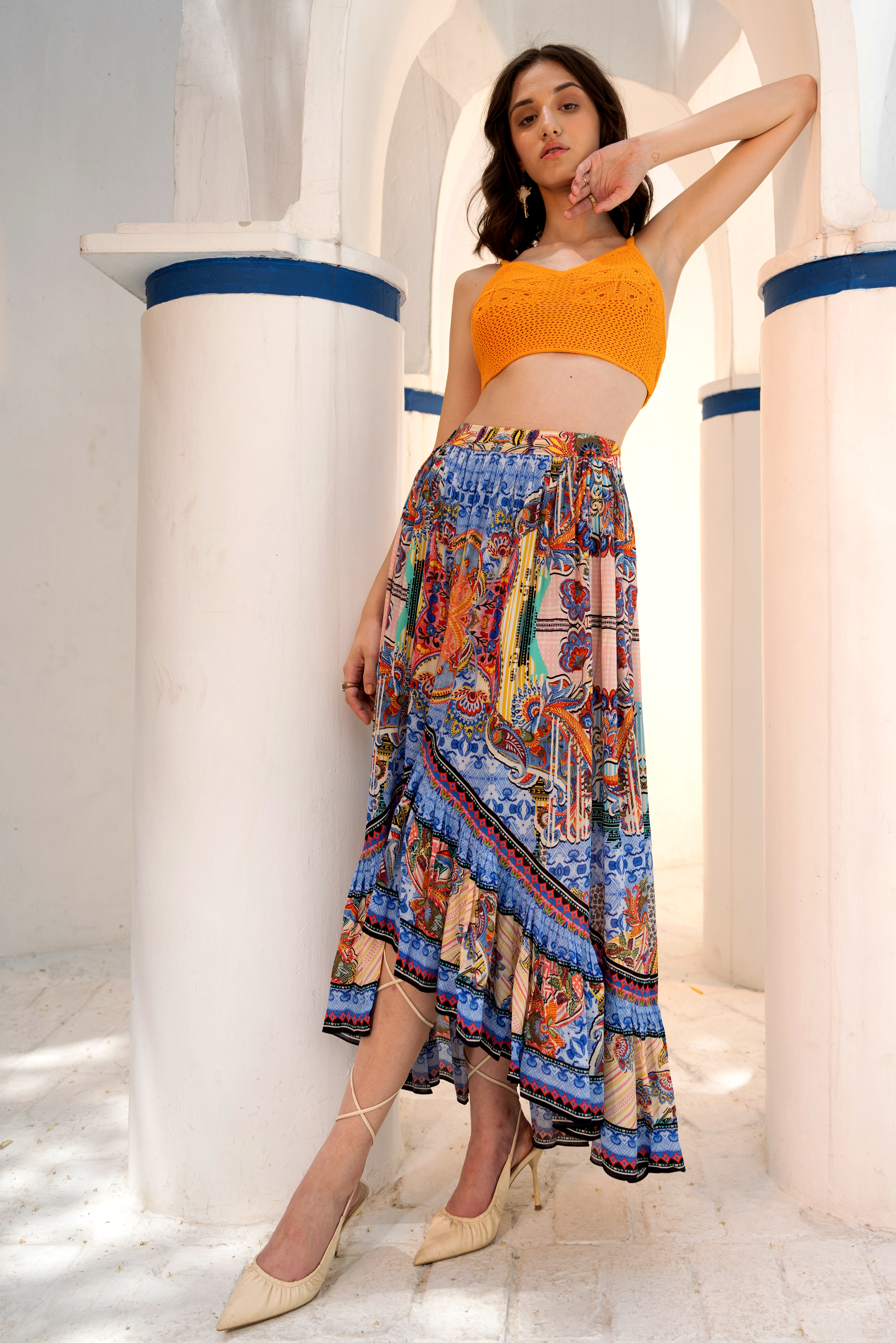 Adorned with a melange of eye-catching prints, this high-low skirt can be styled with graphic tees and knit tops alike.