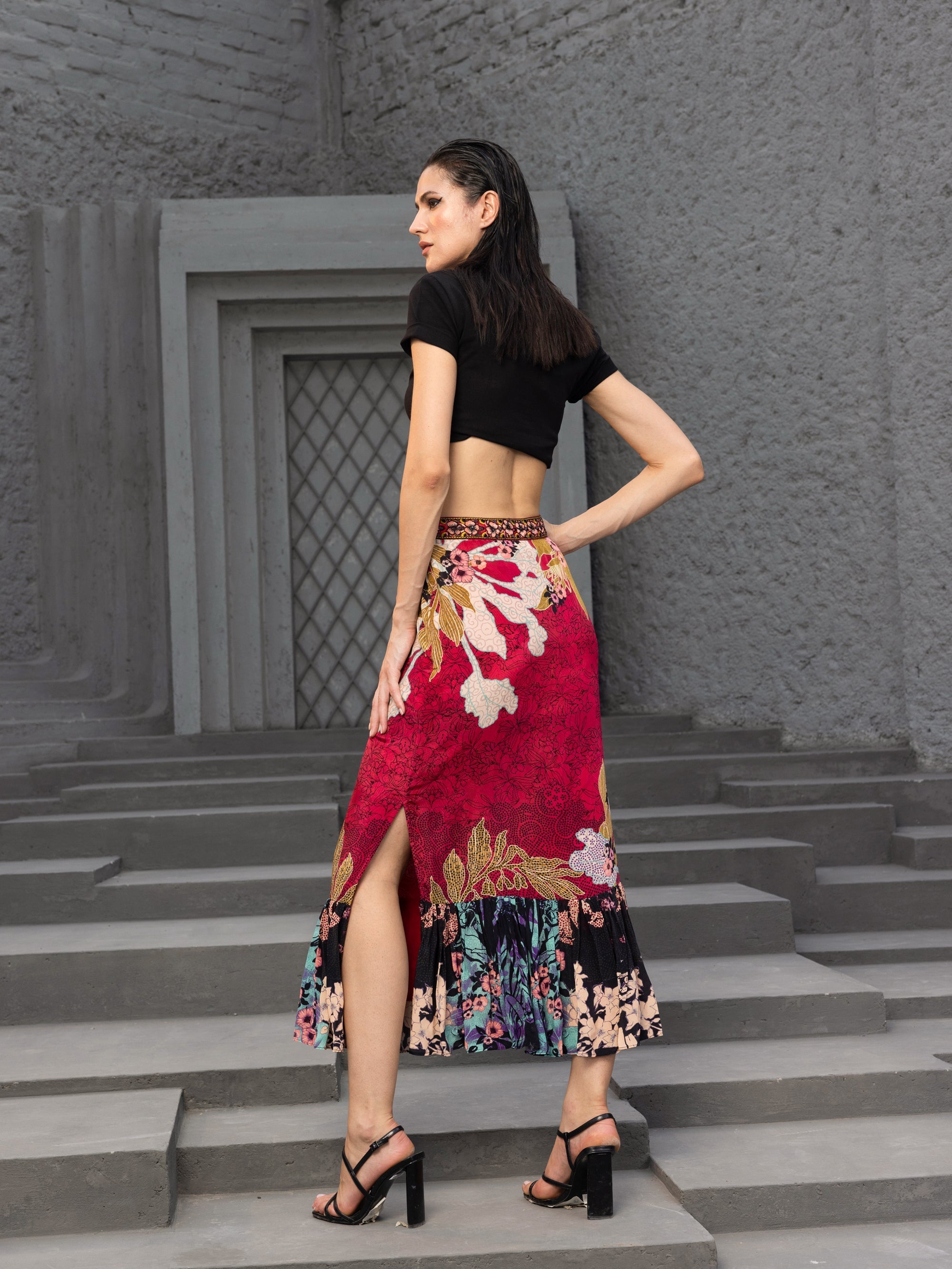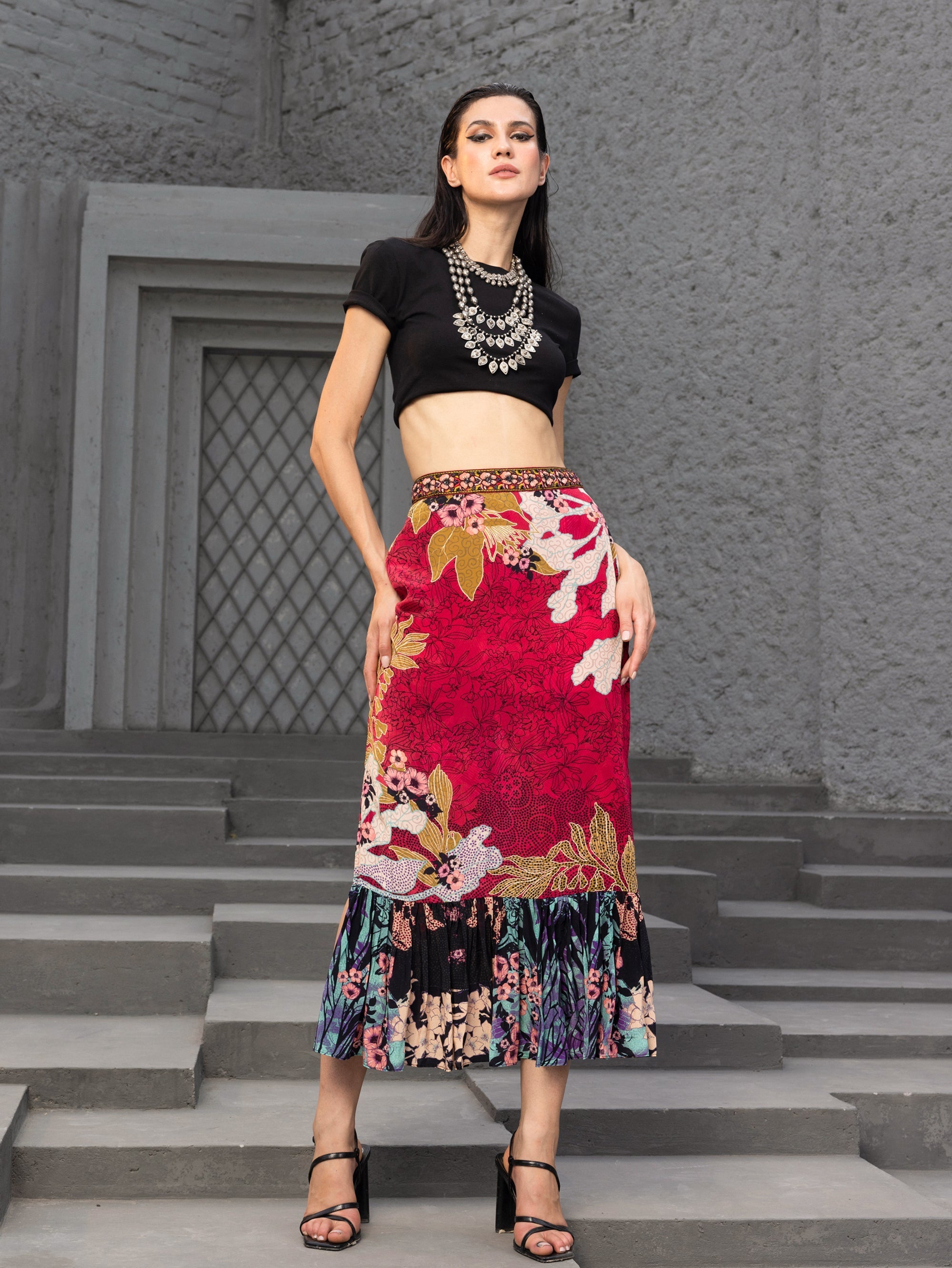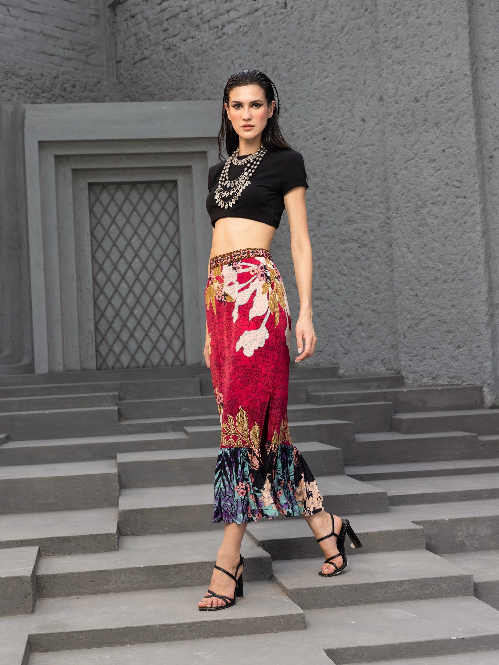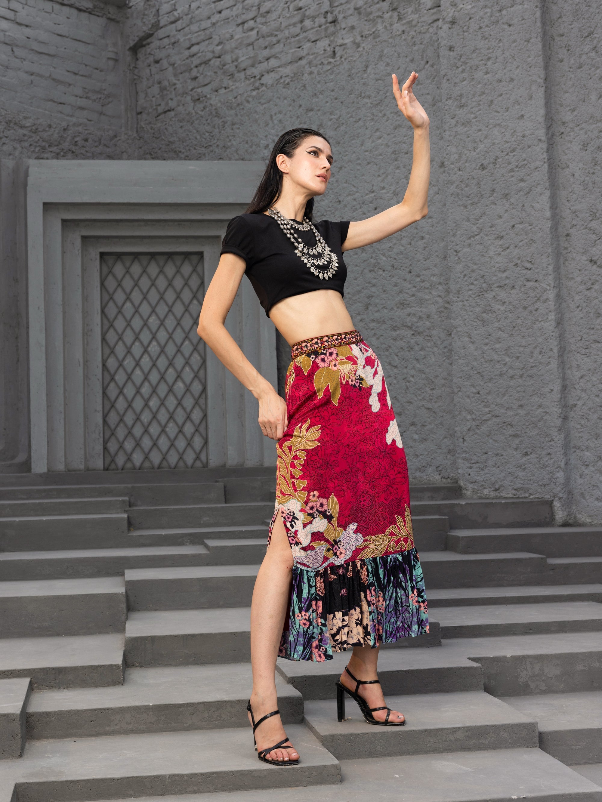 Give your tops an extra dose of glamour by styling hem with this tone on tone skirt.