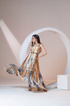 Timeless sophistication with a wide-brimmed hat and flowing fabric