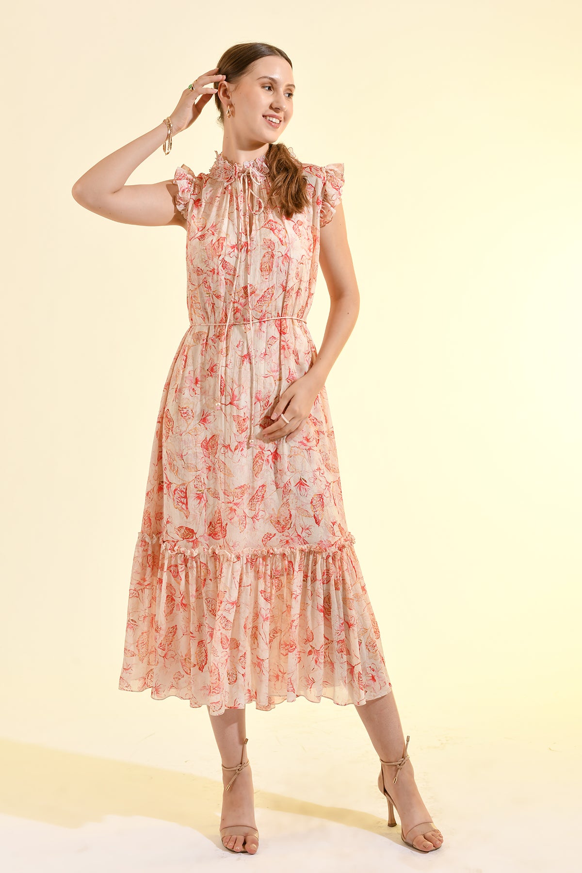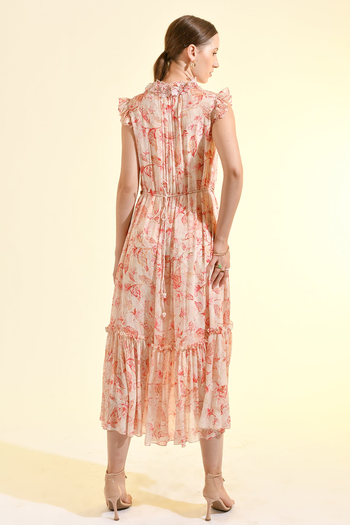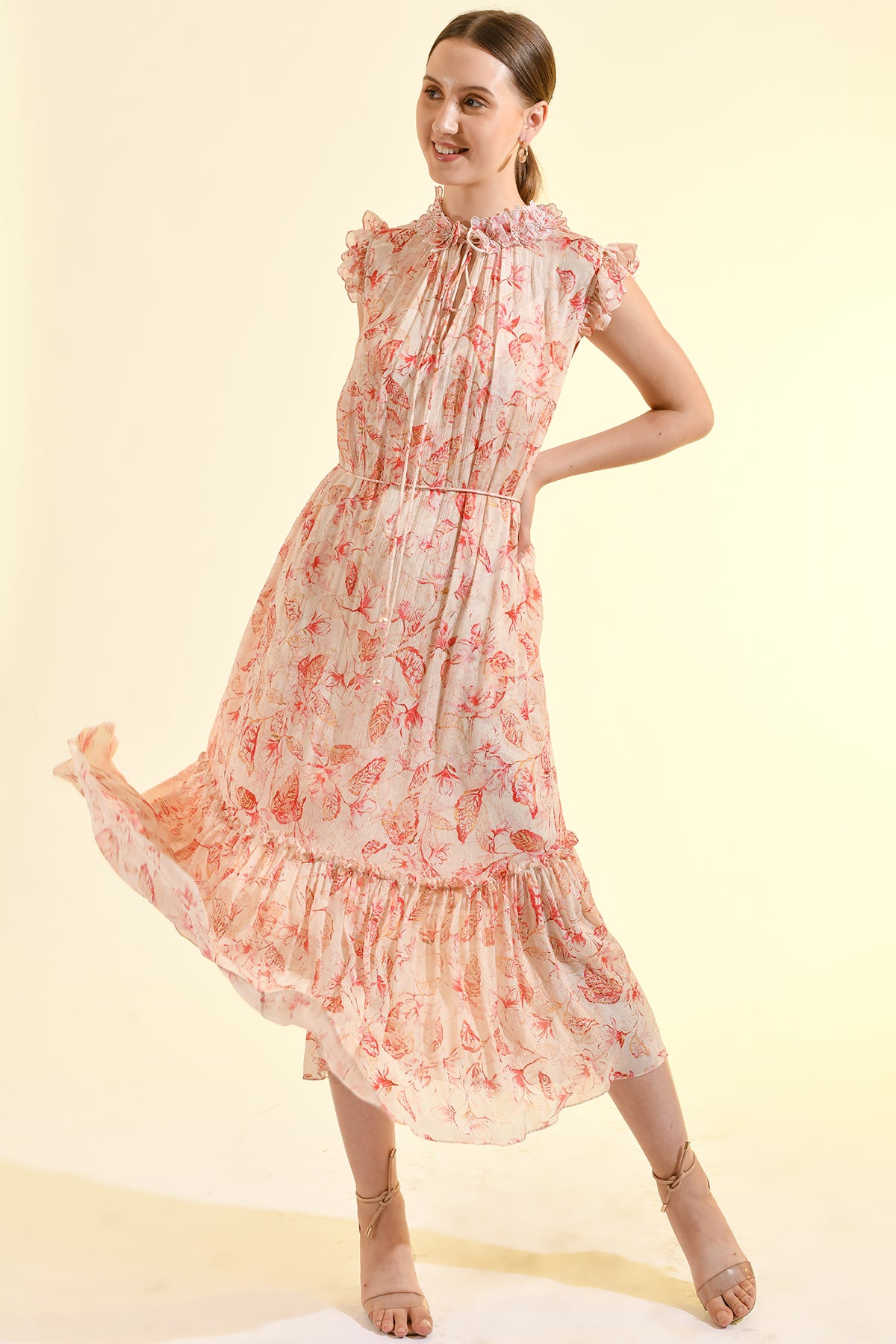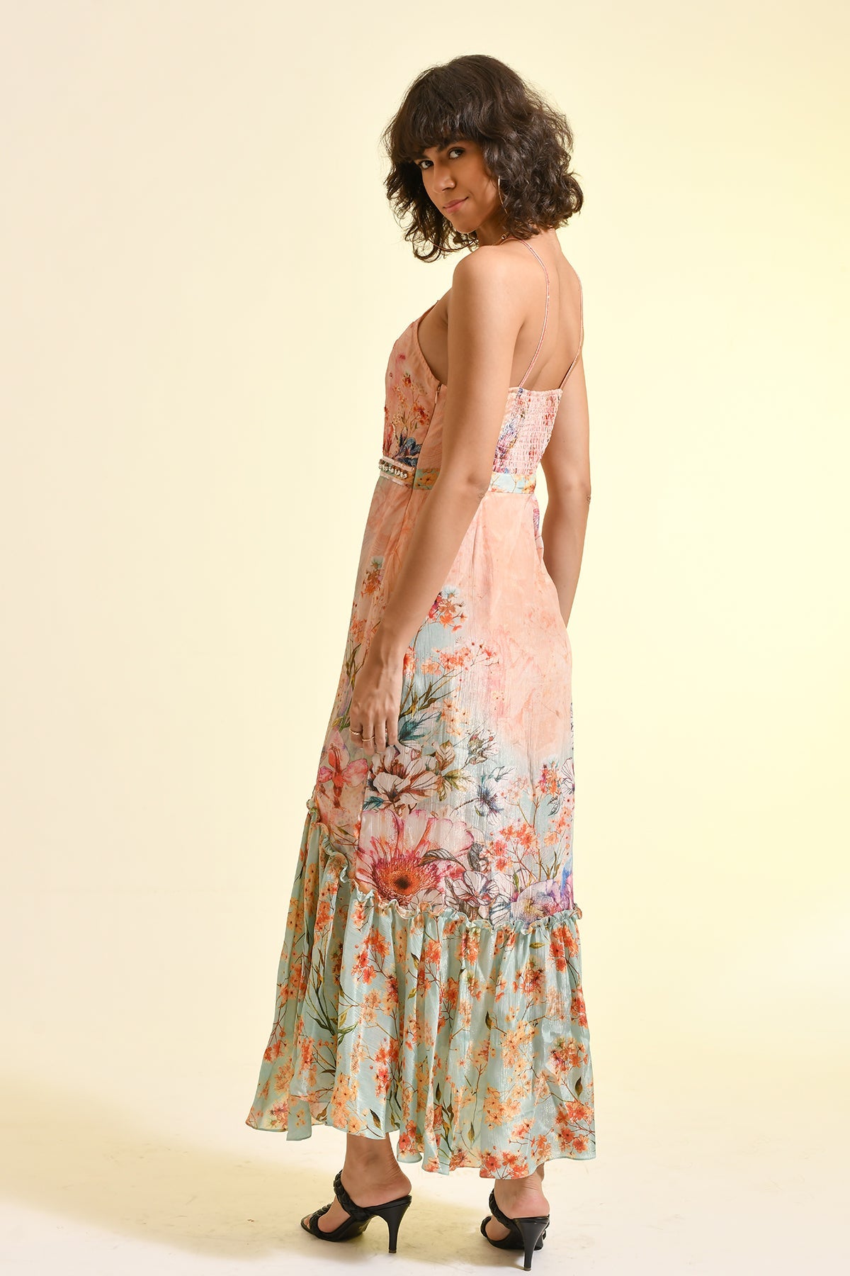 TINTED FLORAL RUFFLE MAXI DRESS