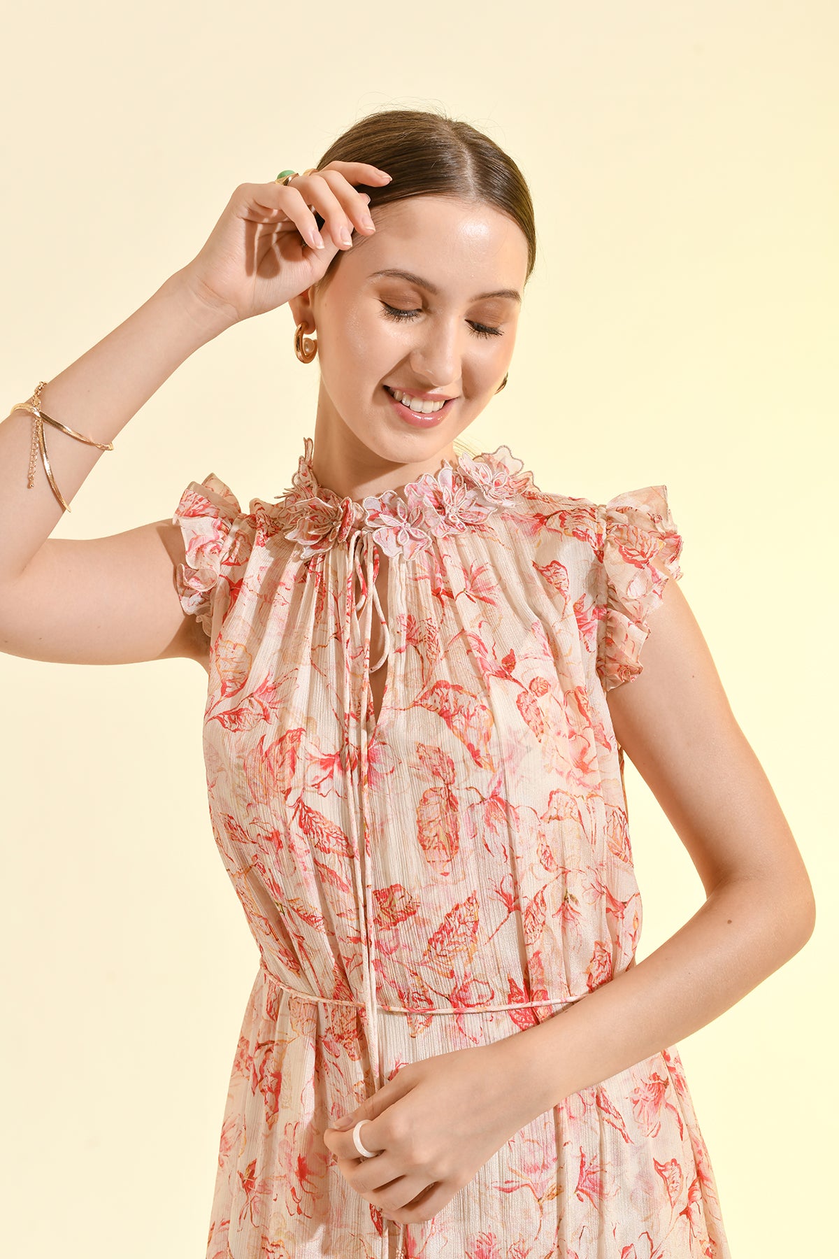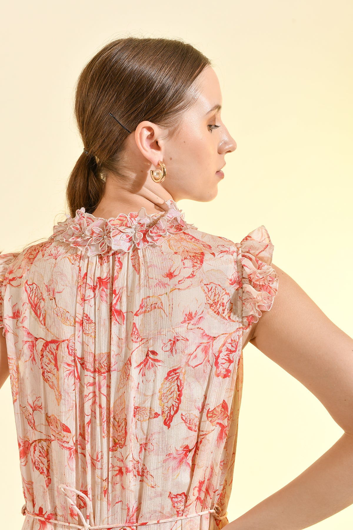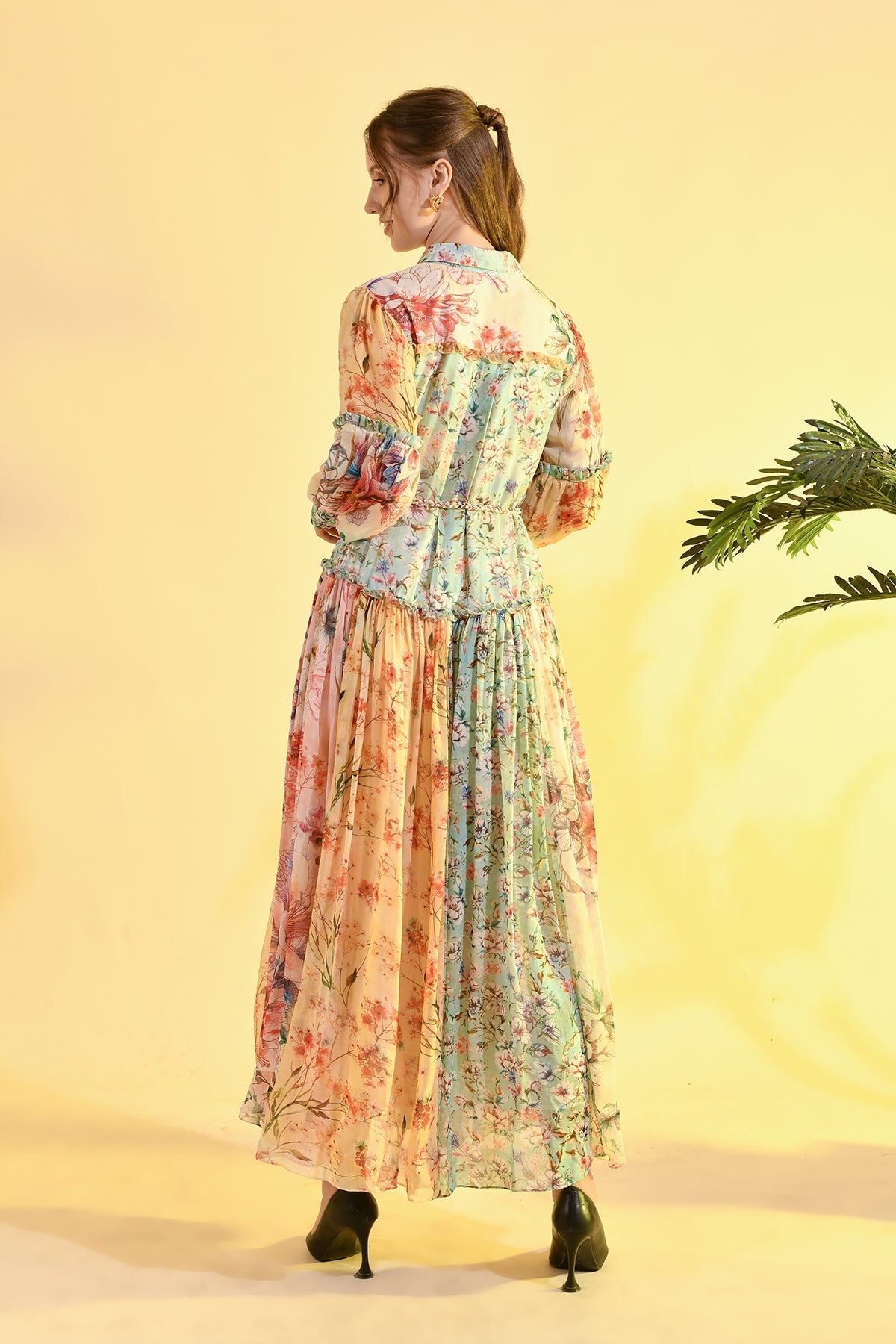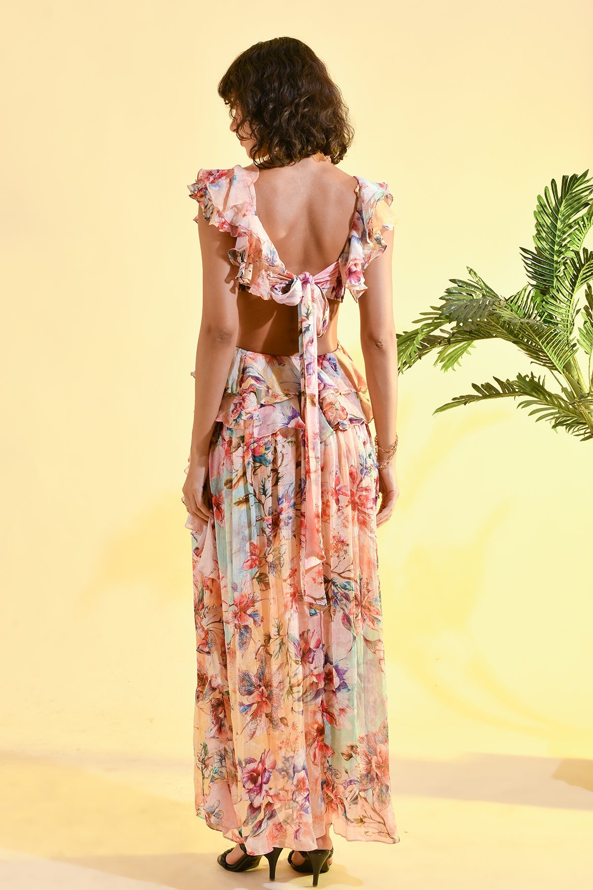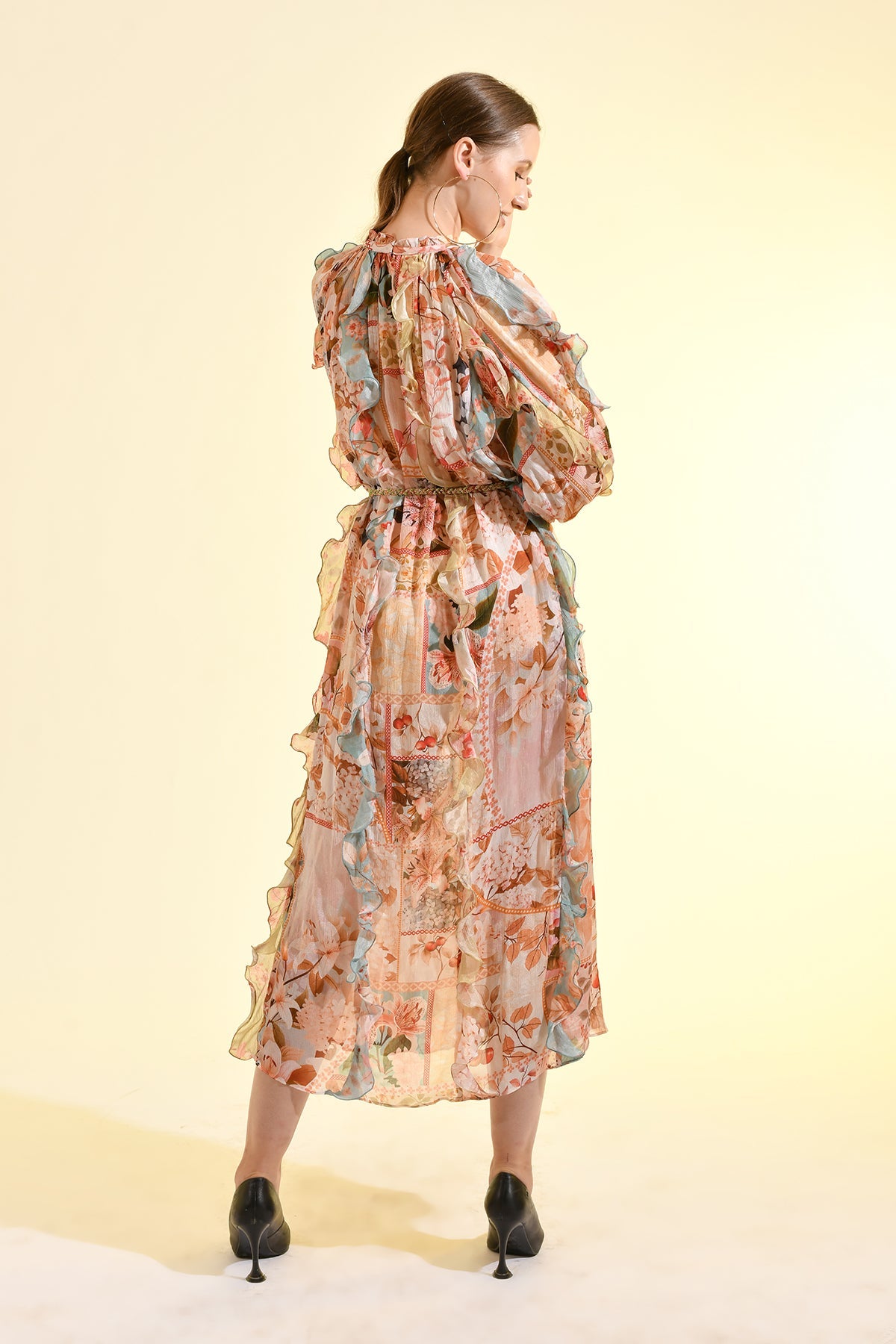 TINTED FLORAL RUFFLE MAXI DRESS