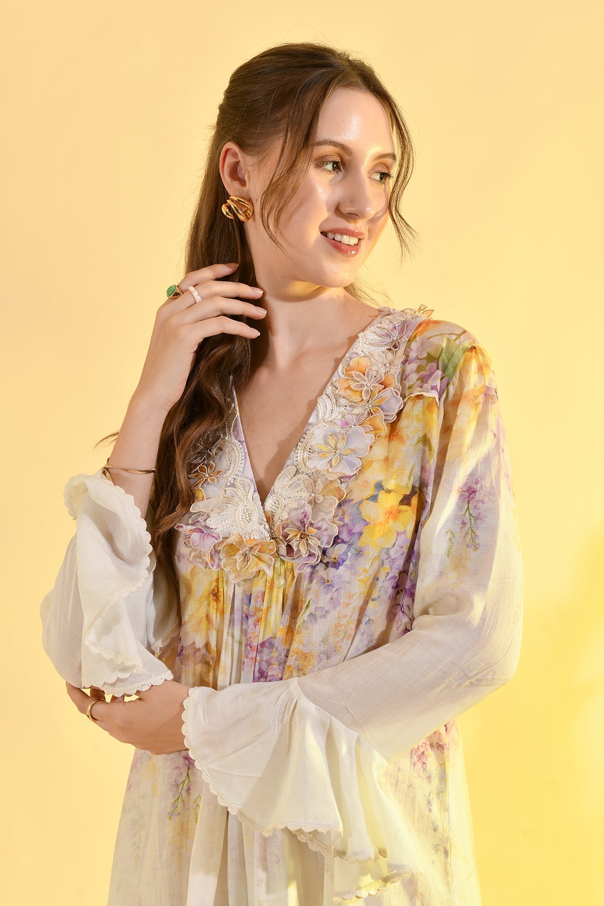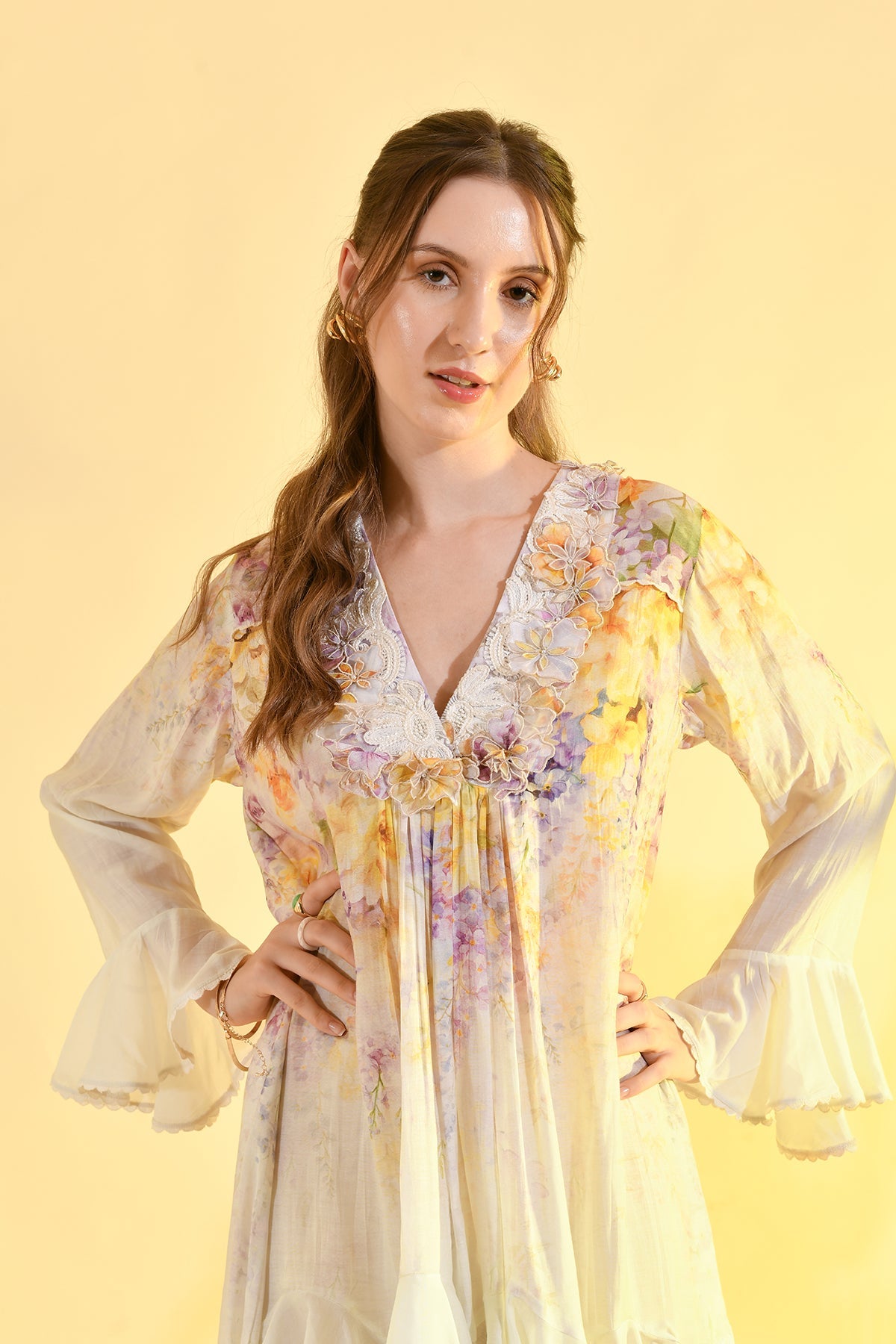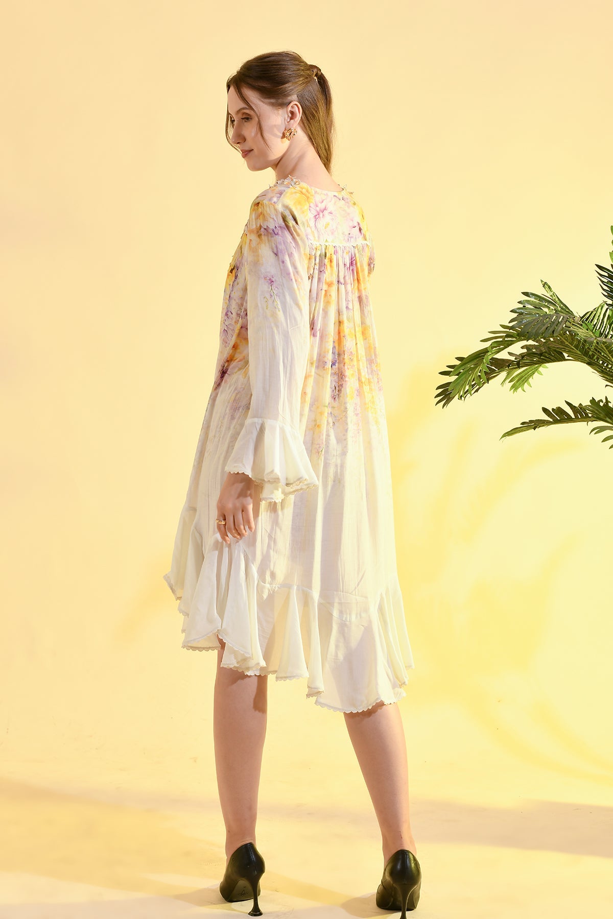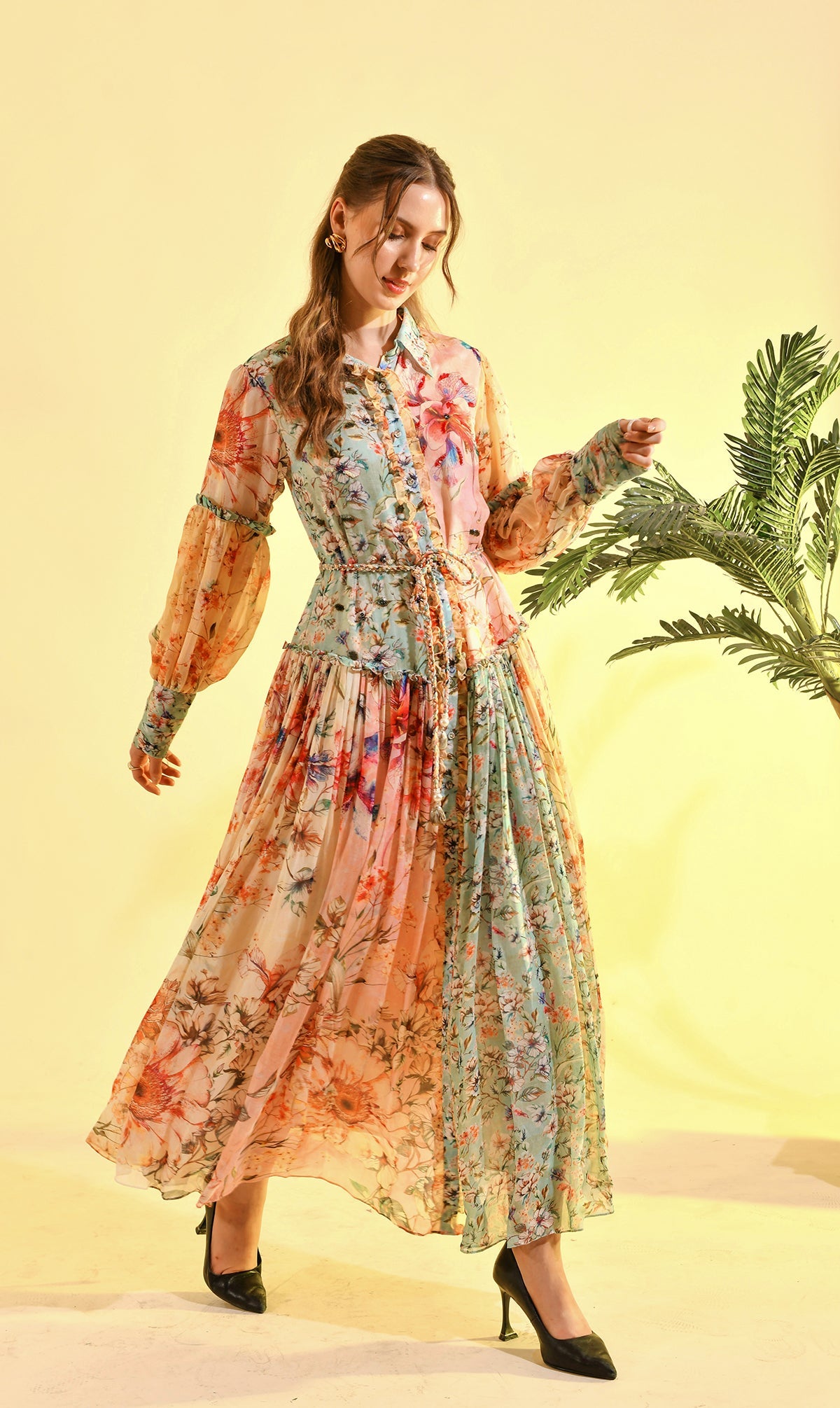 TINTED FLORAL RUFFLE MAXI DRESS